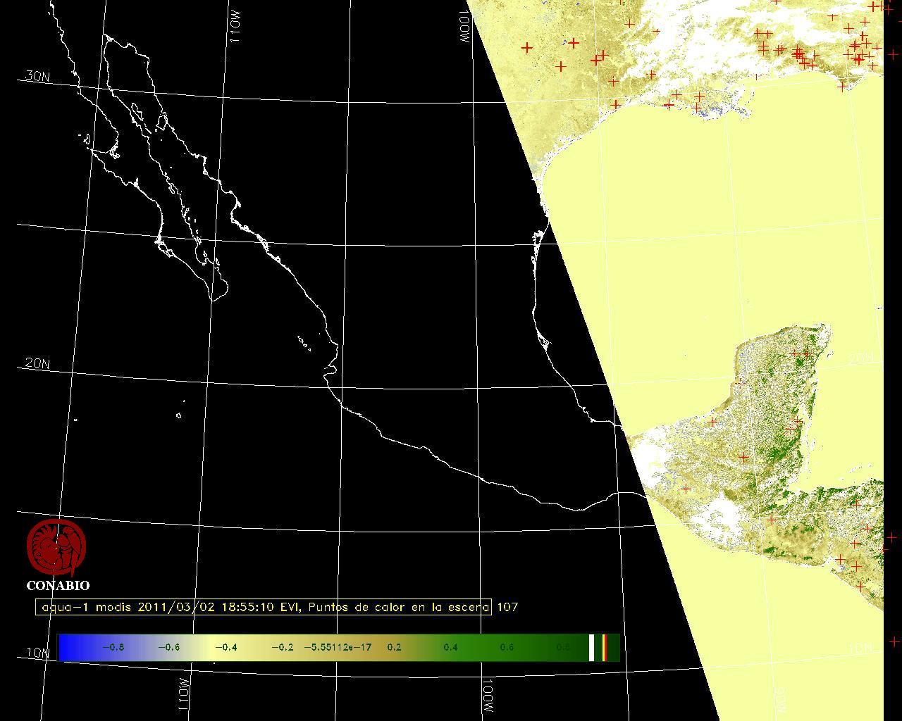 Se considera como punto de calor al elemento espacial mínimo de la imagen (pixel) que reporta una temperatura elevada. Para las imágenes diurnas la temperatura mínima considera es de 42 C y para las imágenes nocturnas es de 25 C. |