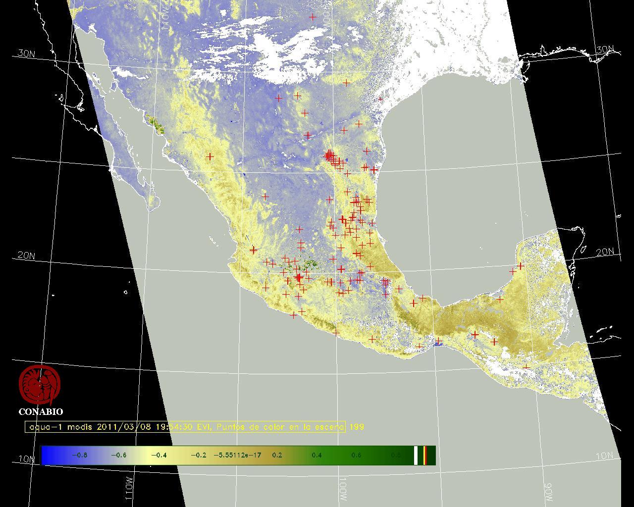 Se considera como punto de calor al elemento espacial mínimo de la imagen (pixel) que reporta una temperatura elevada. Para las imágenes diurnas la temperatura mínima considera es de 42 C y para las imágenes nocturnas es de 25 C. |