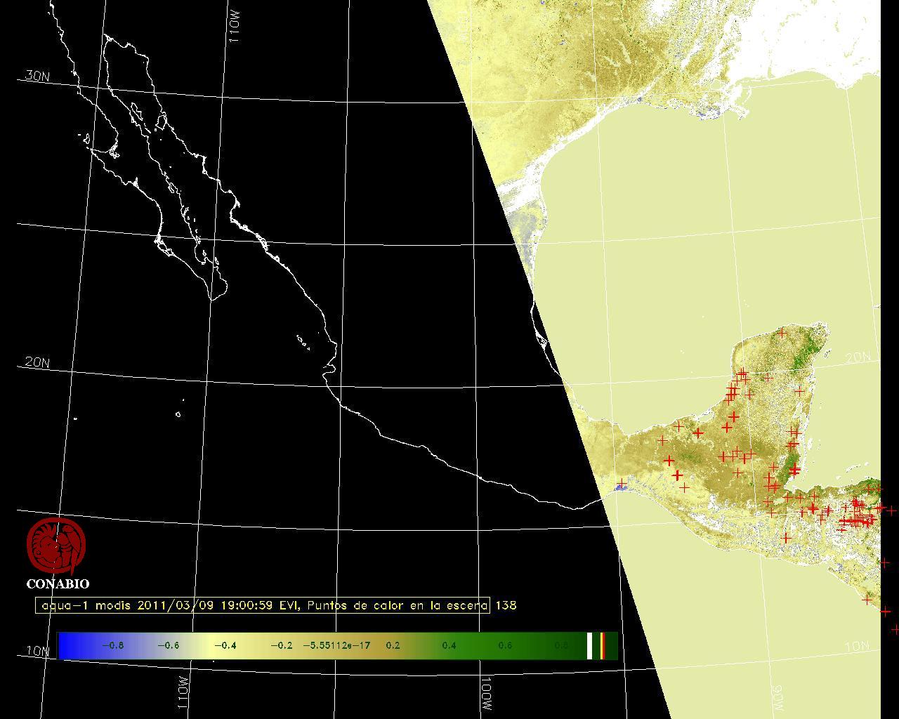Se considera como punto de calor al elemento espacial mínimo de la imagen (pixel) que reporta una temperatura elevada. Para las imágenes diurnas la temperatura mínima considera es de 42 C y para las imágenes nocturnas es de 25 C. |