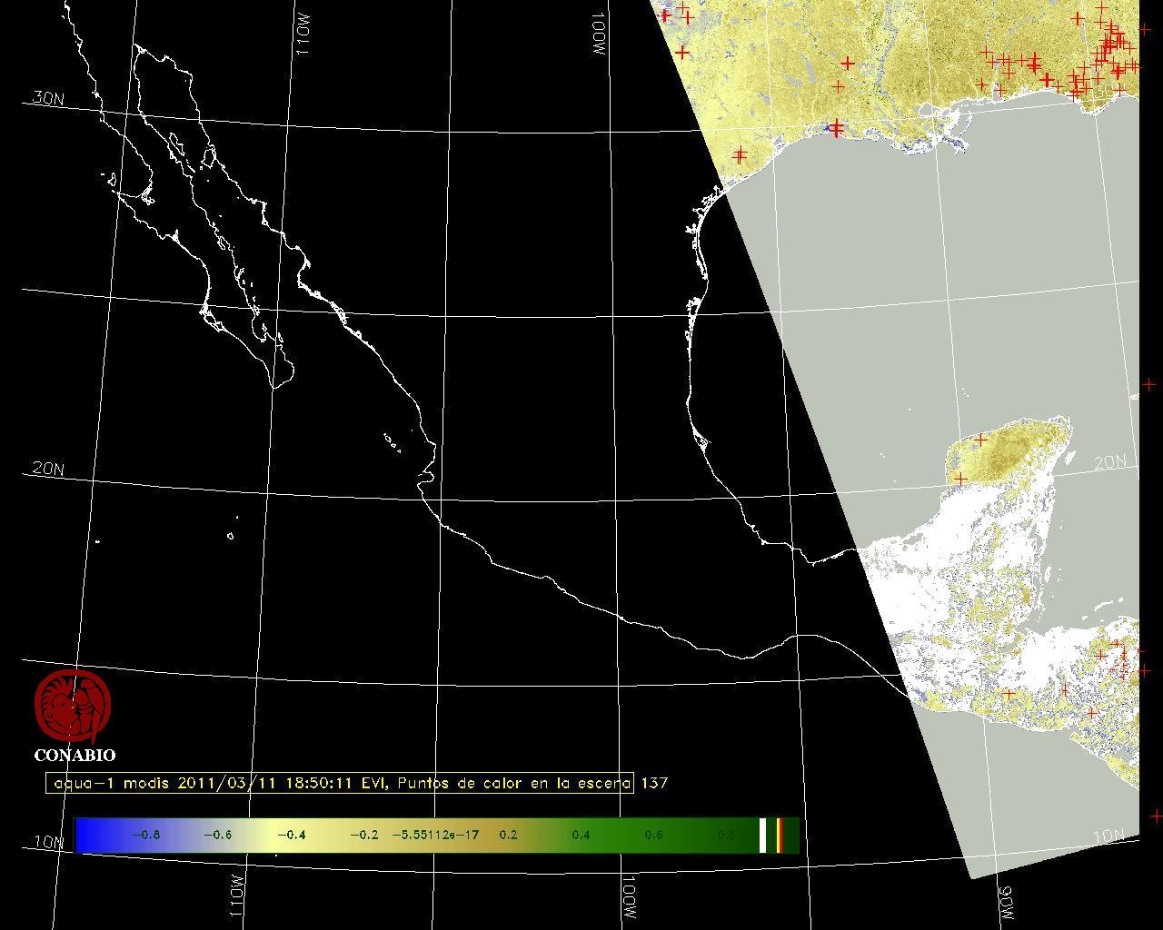 Se considera como punto de calor al elemento espacial mínimo de la imagen (pixel) que reporta una temperatura elevada. Para las imágenes diurnas la temperatura mínima considera es de 42 C y para las imágenes nocturnas es de 25 C. |