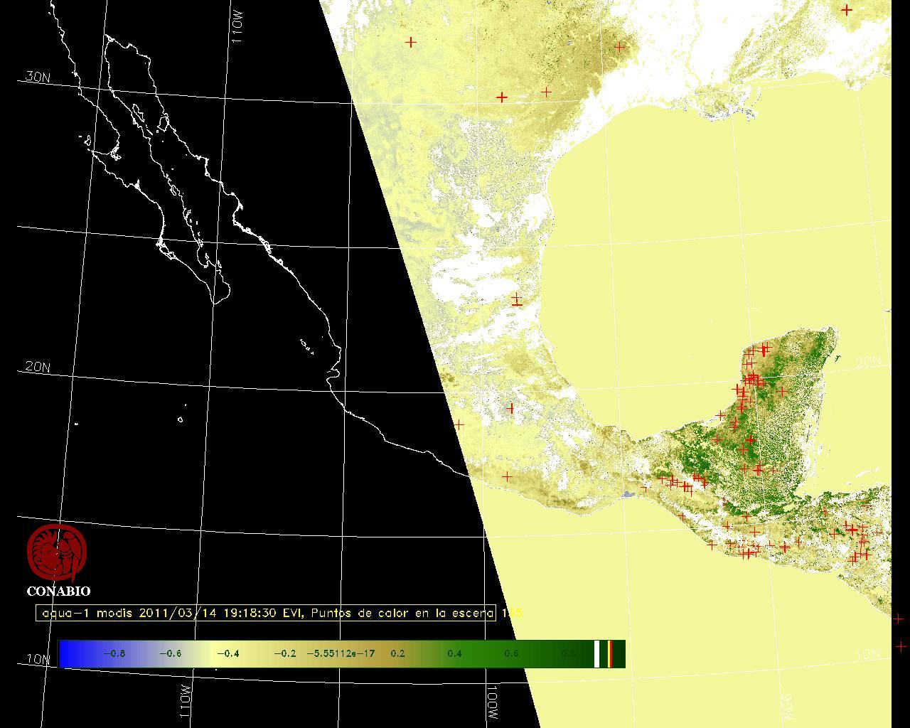 Se considera como punto de calor al elemento espacial mínimo de la imagen (pixel) que reporta una temperatura elevada. Para las imágenes diurnas la temperatura mínima considera es de 42 C y para las imágenes nocturnas es de 25 C. |