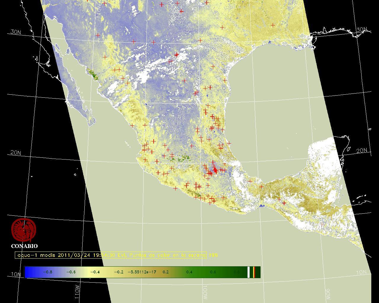 Se considera como punto de calor al elemento espacial mínimo de la imagen (pixel) que reporta una temperatura elevada. Para las imágenes diurnas la temperatura mínima considera es de 42 C y para las imágenes nocturnas es de 25 C. |