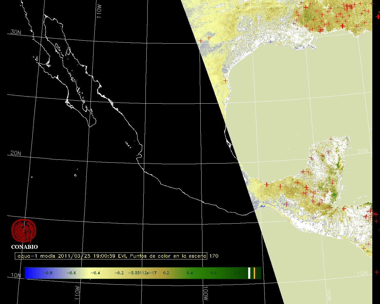 Se considera como punto de calor al elemento espacial mínimo de la imagen (pixel) que reporta una temperatura elevada. Para las imágenes diurnas la temperatura mínima considera es de 42 C y para las imágenes nocturnas es de 25 C. |