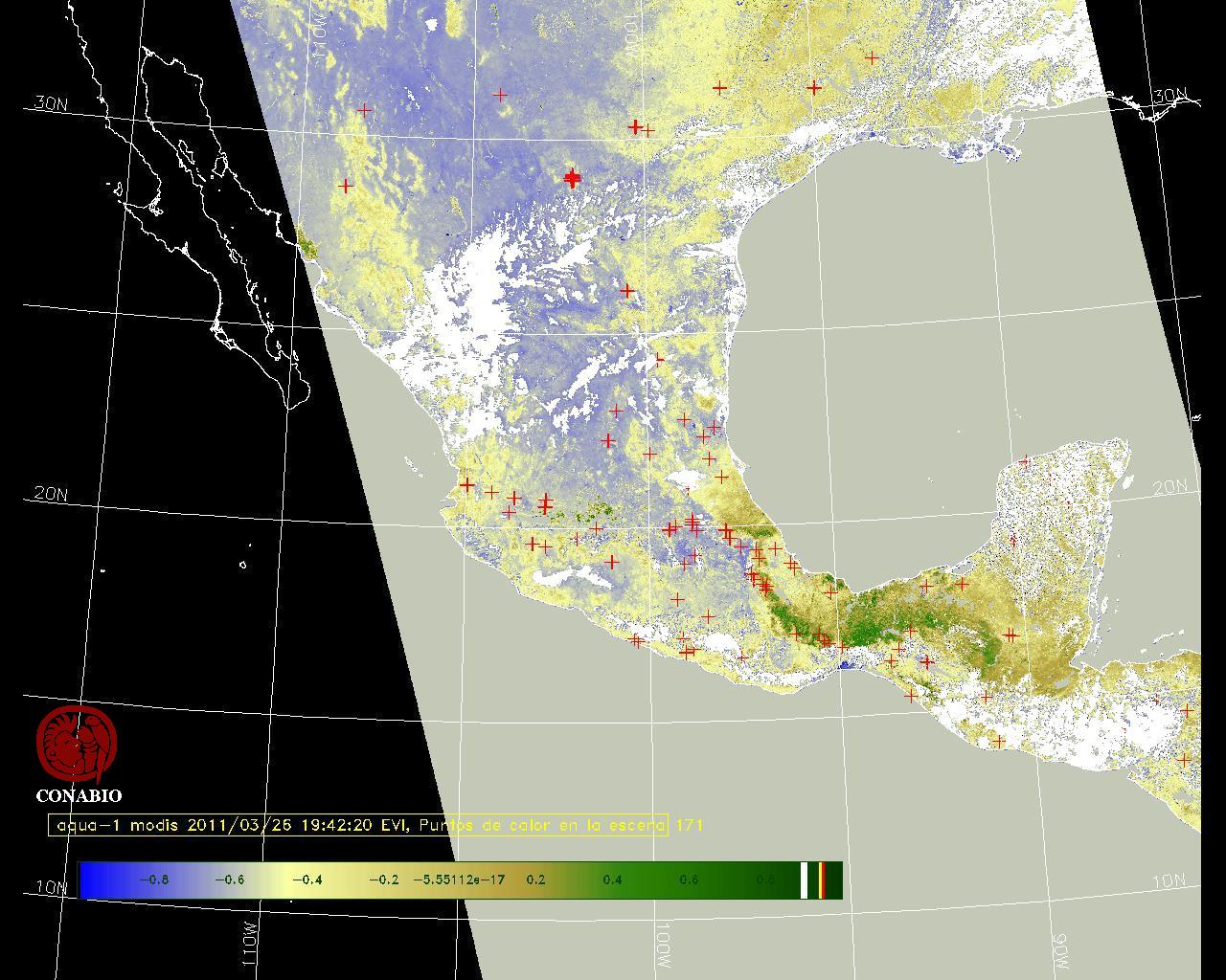 Se considera como punto de calor al elemento espacial mínimo de la imagen (pixel) que reporta una temperatura elevada. Para las imágenes diurnas la temperatura mínima considera es de 42 C y para las imágenes nocturnas es de 25 C. |