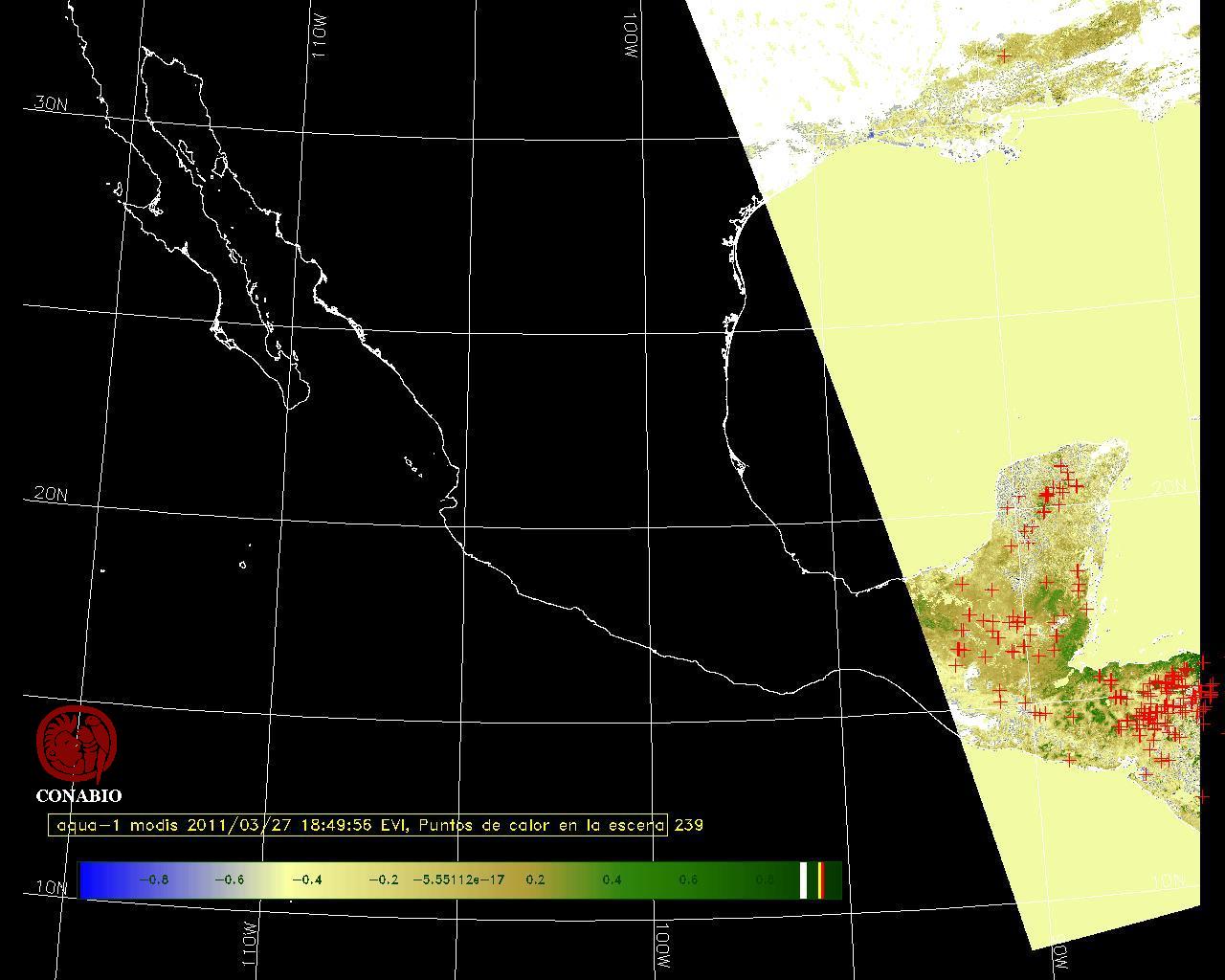 Se considera como punto de calor al elemento espacial mínimo de la imagen (pixel) que reporta una temperatura elevada. Para las imágenes diurnas la temperatura mínima considera es de 42 C y para las imágenes nocturnas es de 25 C. |
