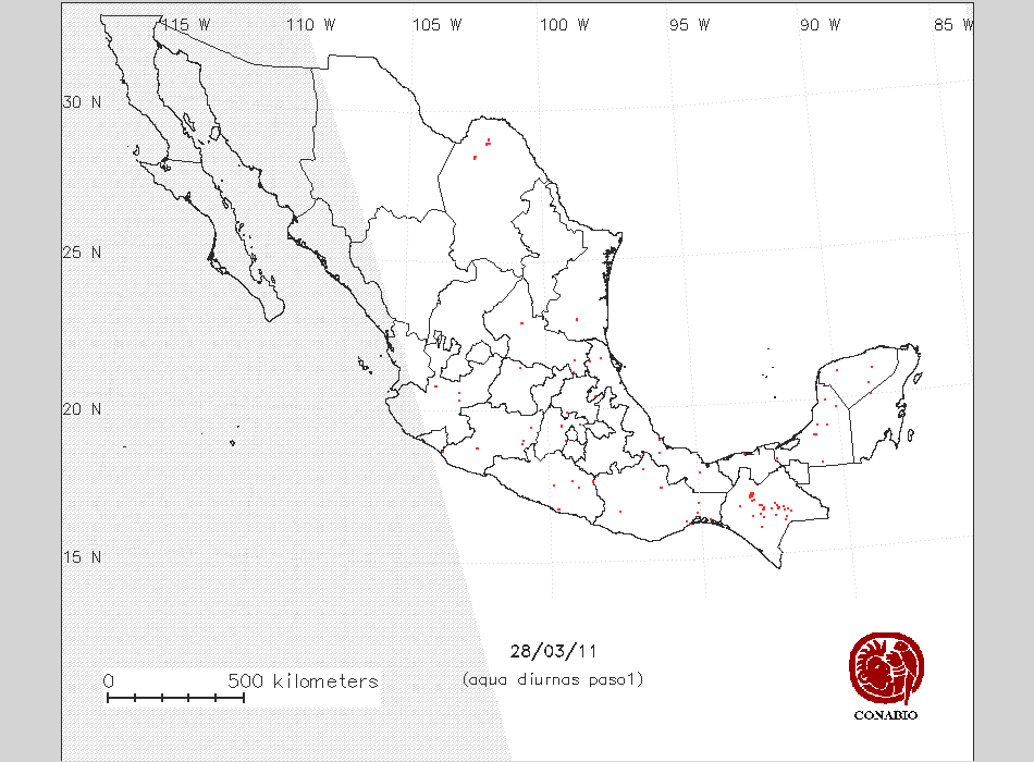 Se considera como punto de calor al elemento espacial mínimo de la imagen (pixel) que reporta una temperatura elevada. Para las imágenes diurnas la temperatura mínima considera es de 42 C y para las imágenes nocturnas es de 25 C. |