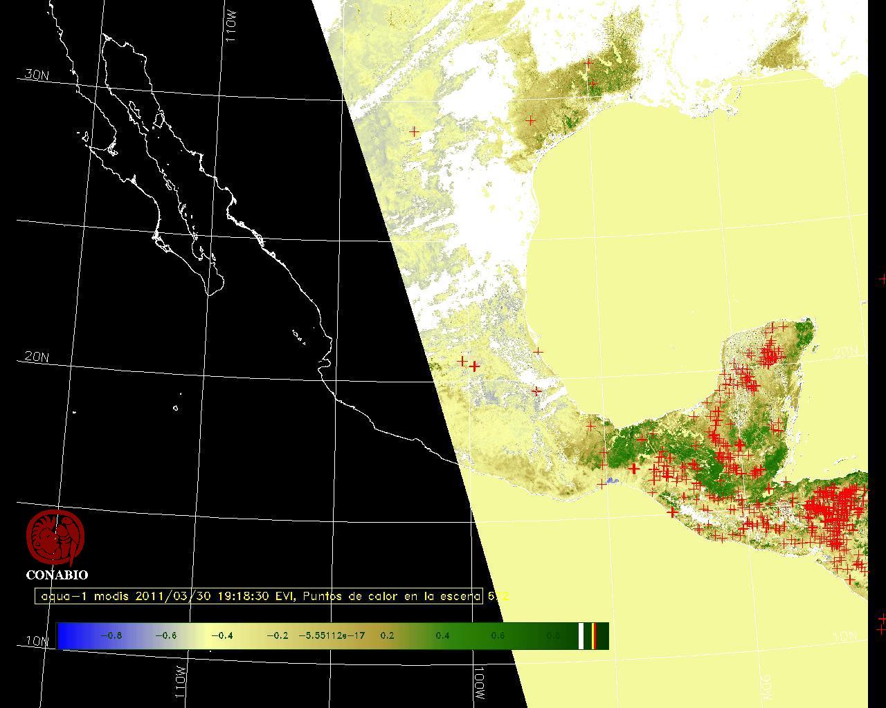 Se considera como punto de calor al elemento espacial mínimo de la imagen (pixel) que reporta una temperatura elevada. Para las imágenes diurnas la temperatura mínima considera es de 42 C y para las imágenes nocturnas es de 25 C. |