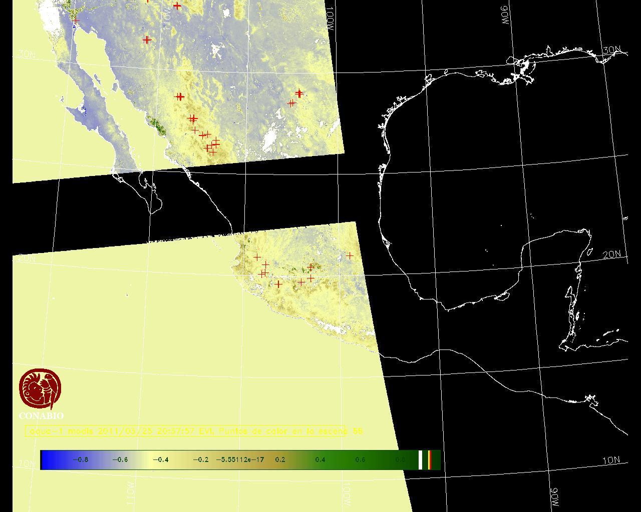 Se considera como punto de calor al elemento espacial mínimo de la imagen (pixel) que reporta una temperatura elevada. Para las imágenes diurnas la temperatura mínima considera es de 42 C y para las imágenes nocturnas es de 25 C. |