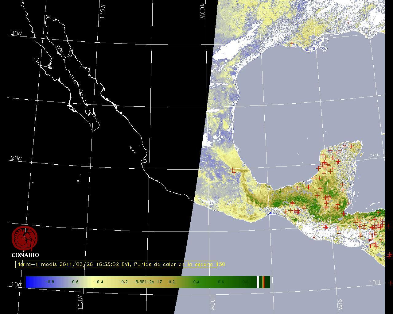 Se considera como punto de calor al elemento espacial mínimo de la imagen (pixel) que reporta una temperatura elevada. Para las imágenes diurnas la temperatura mínima considera es de 42 C y para las imágenes nocturnas es de 25 C. |