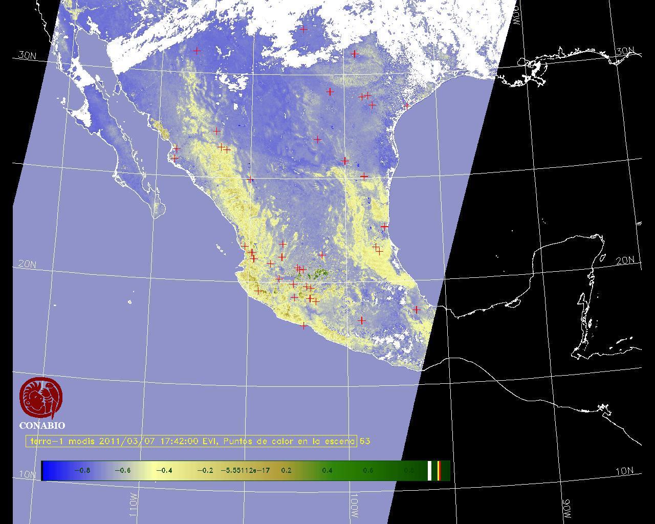 Se considera como punto de calor al elemento espacial mínimo de la imagen (pixel) que reporta una temperatura elevada. Para las imágenes diurnas la temperatura mínima considera es de 42 C y para las imágenes nocturnas es de 25 C. |