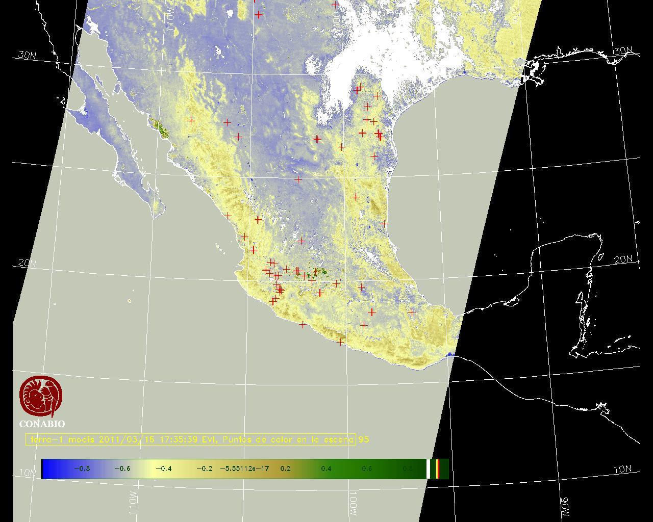 Se considera como punto de calor al elemento espacial mínimo de la imagen (pixel) que reporta una temperatura elevada. Para las imágenes diurnas la temperatura mínima considera es de 42 C y para las imágenes nocturnas es de 25 C. |