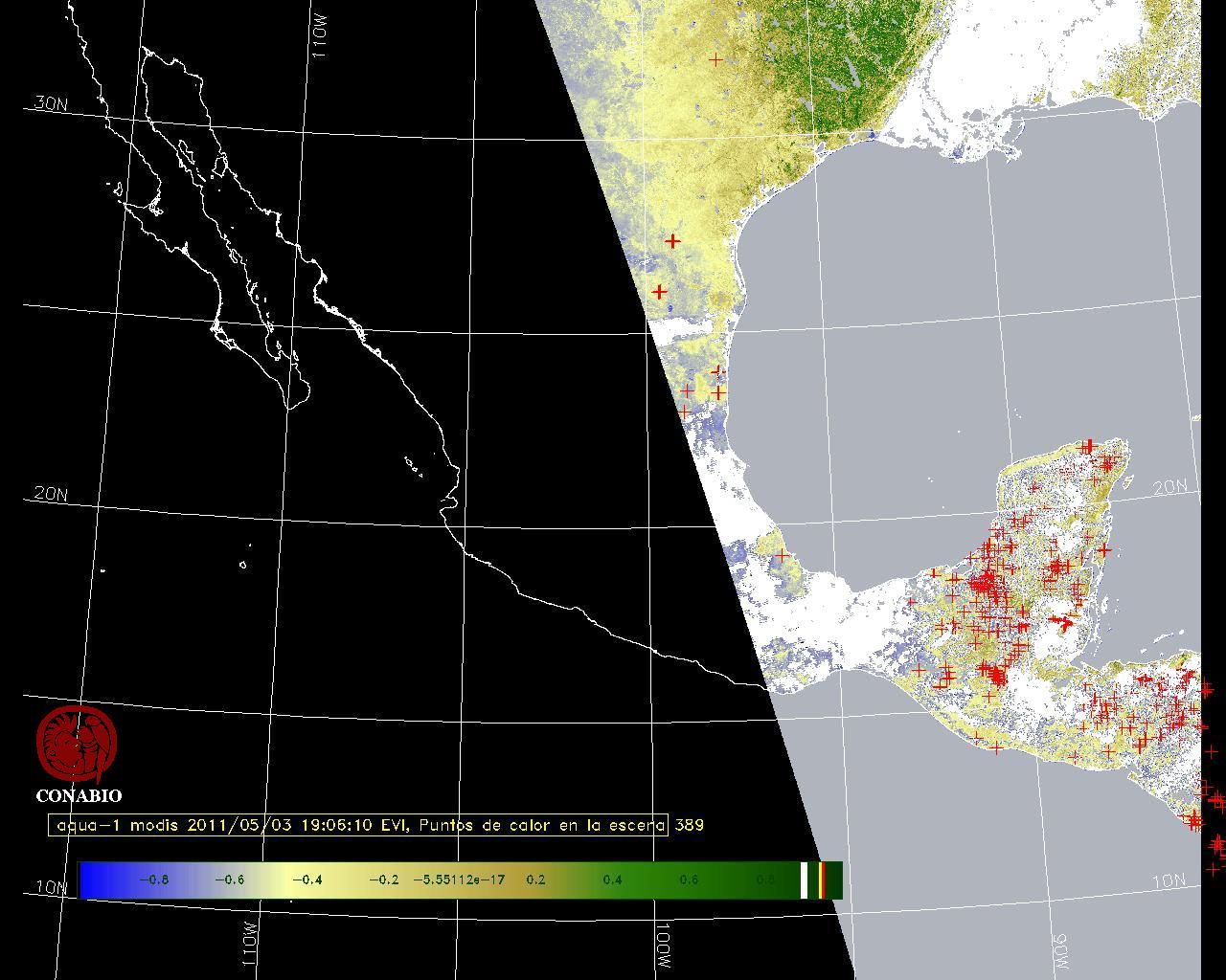 Se considera como punto de calor al elemento espacial mínimo de la imagen (pixel) que reporta una temperatura elevada. Para las imágenes diurnas la temperatura mínima considera es de 42 C y para las imágenes nocturnas es de 25 C. |