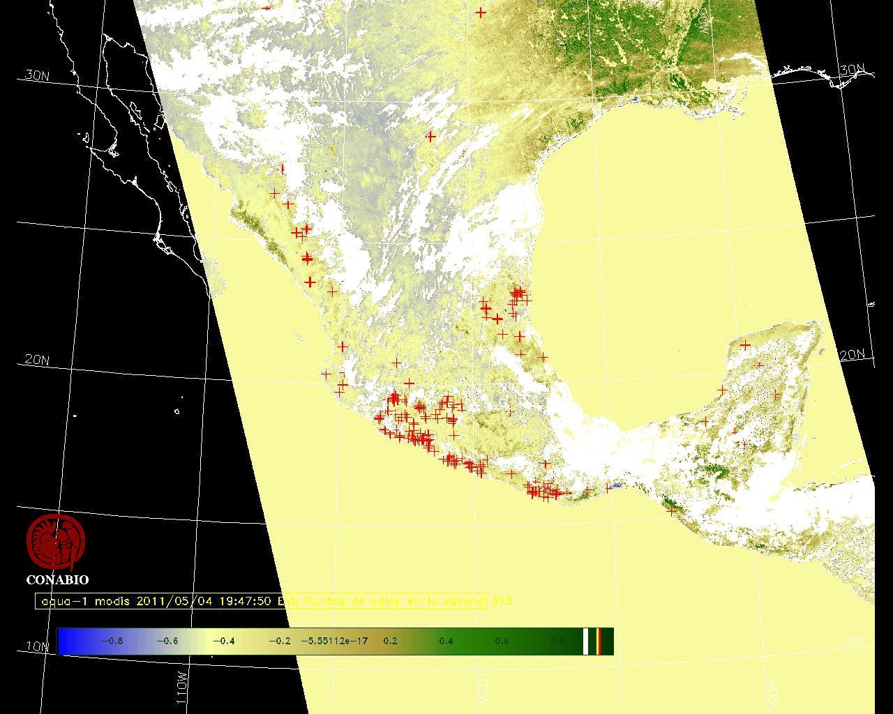Se considera como punto de calor al elemento espacial mínimo de la imagen (pixel) que reporta una temperatura elevada. Para las imágenes diurnas la temperatura mínima considera es de 42 C y para las imágenes nocturnas es de 25 C. |
