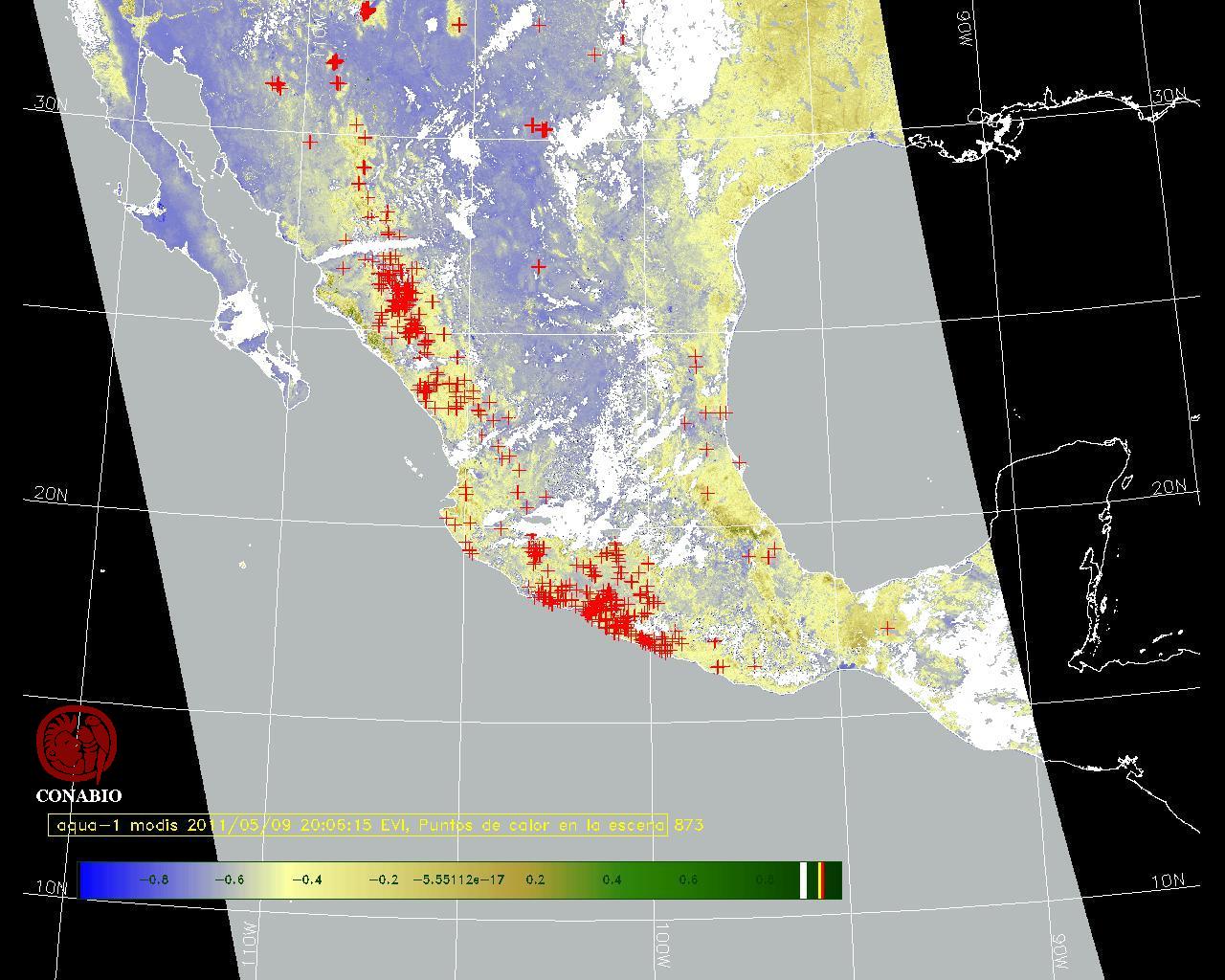 Se considera como punto de calor al elemento espacial mínimo de la imagen (pixel) que reporta una temperatura elevada. Para las imágenes diurnas la temperatura mínima considera es de 42 C y para las imágenes nocturnas es de 25 C. |