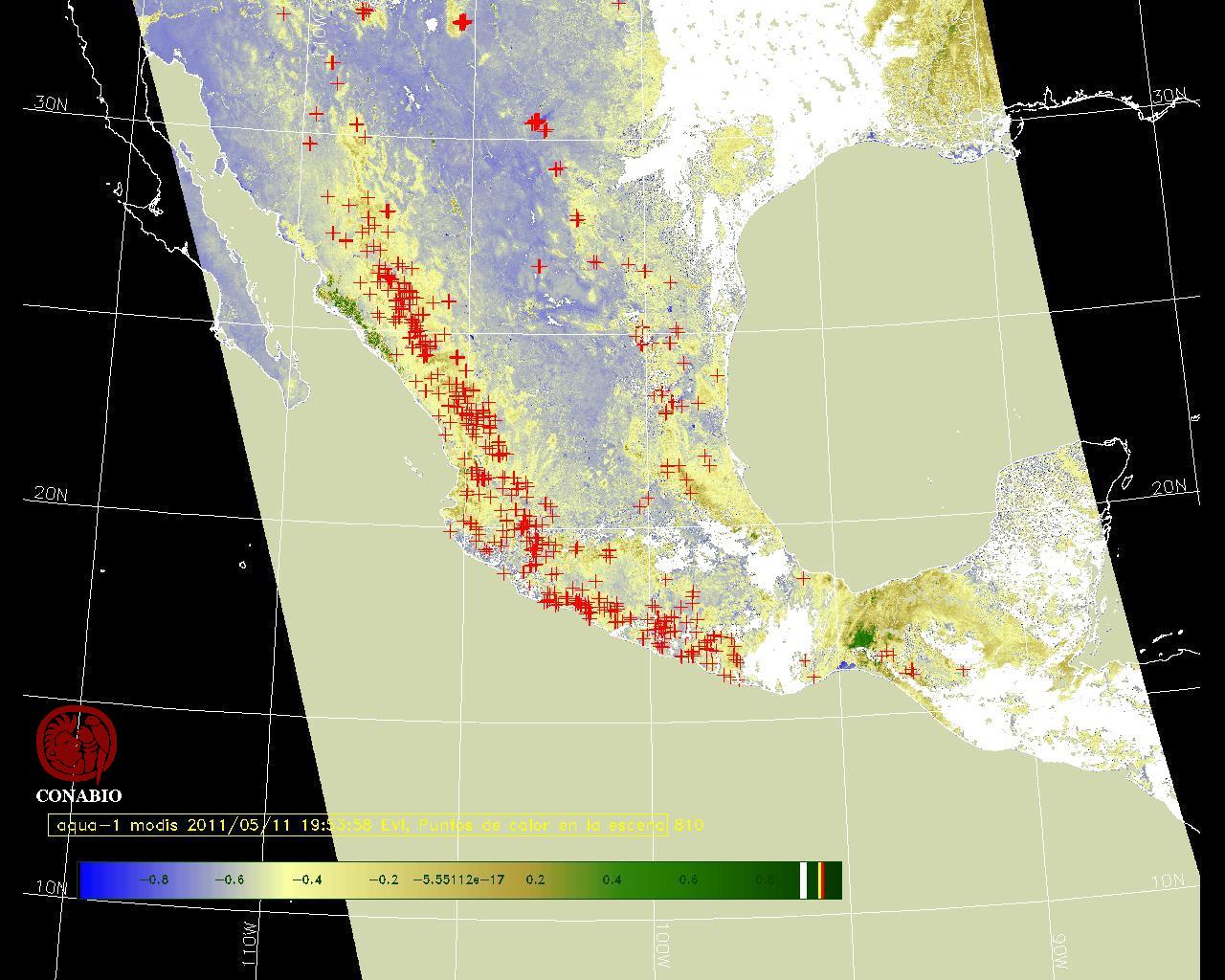 Se considera como punto de calor al elemento espacial mínimo de la imagen (pixel) que reporta una temperatura elevada. Para las imágenes diurnas la temperatura mínima considera es de 42 C y para las imágenes nocturnas es de 25 C. |