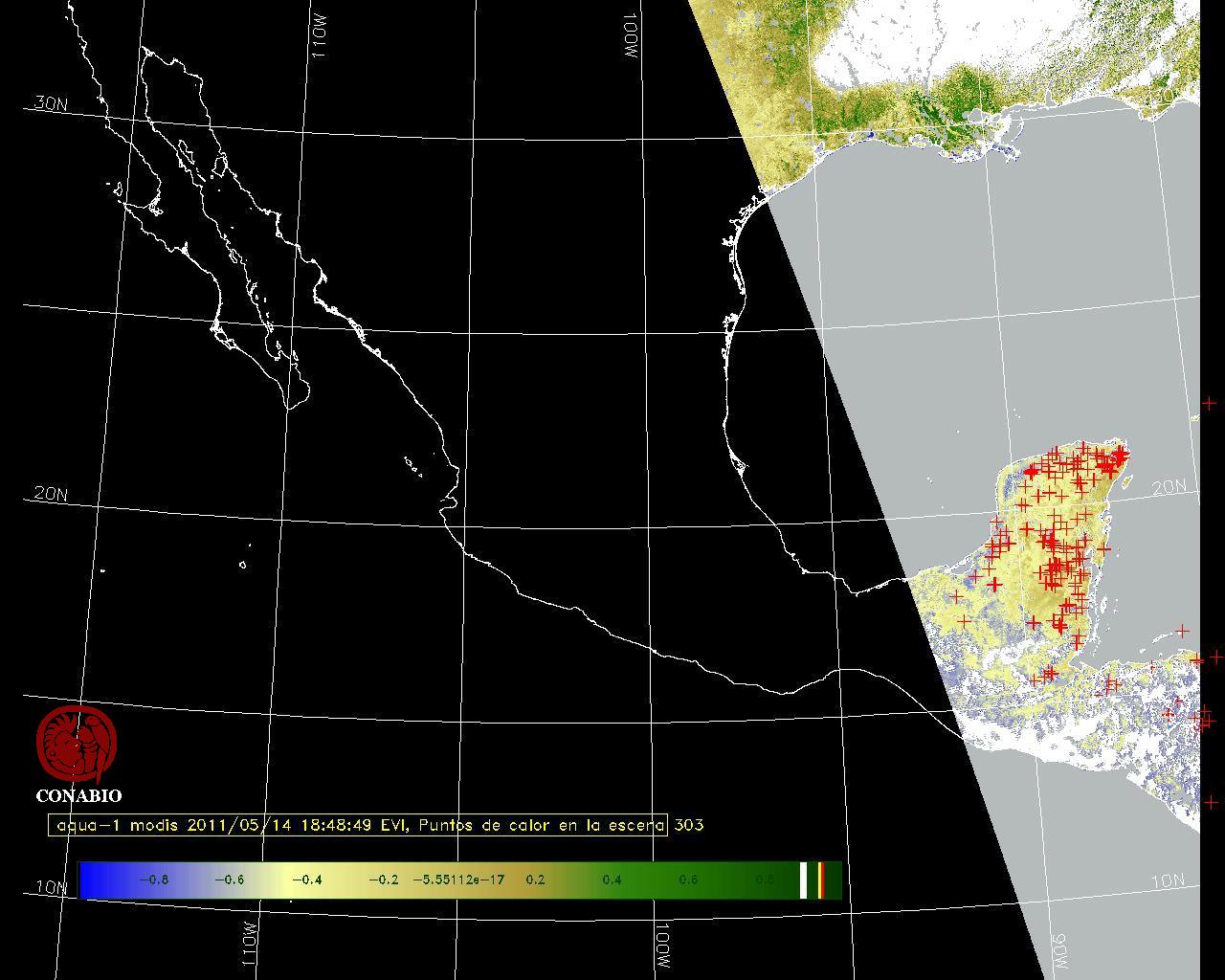 Se considera como punto de calor al elemento espacial mínimo de la imagen (pixel) que reporta una temperatura elevada. Para las imágenes diurnas la temperatura mínima considera es de 42 C y para las imágenes nocturnas es de 25 C. |
