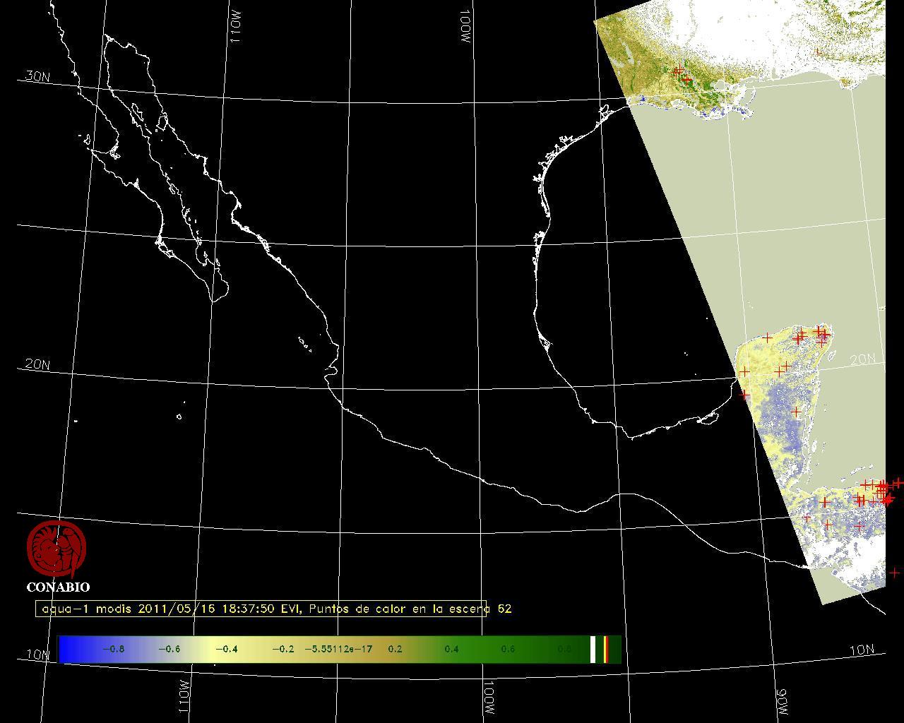 Se considera como punto de calor al elemento espacial mínimo de la imagen (pixel) que reporta una temperatura elevada. Para las imágenes diurnas la temperatura mínima considera es de 42 C y para las imágenes nocturnas es de 25 C. |