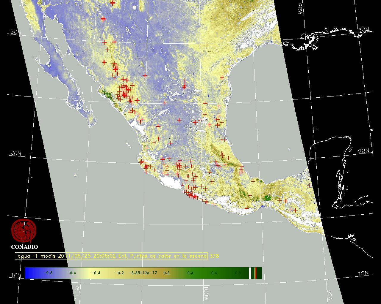 Se considera como punto de calor al elemento espacial mínimo de la imagen (pixel) que reporta una temperatura elevada. Para las imágenes diurnas la temperatura mínima considera es de 42 C y para las imágenes nocturnas es de 25 C. |