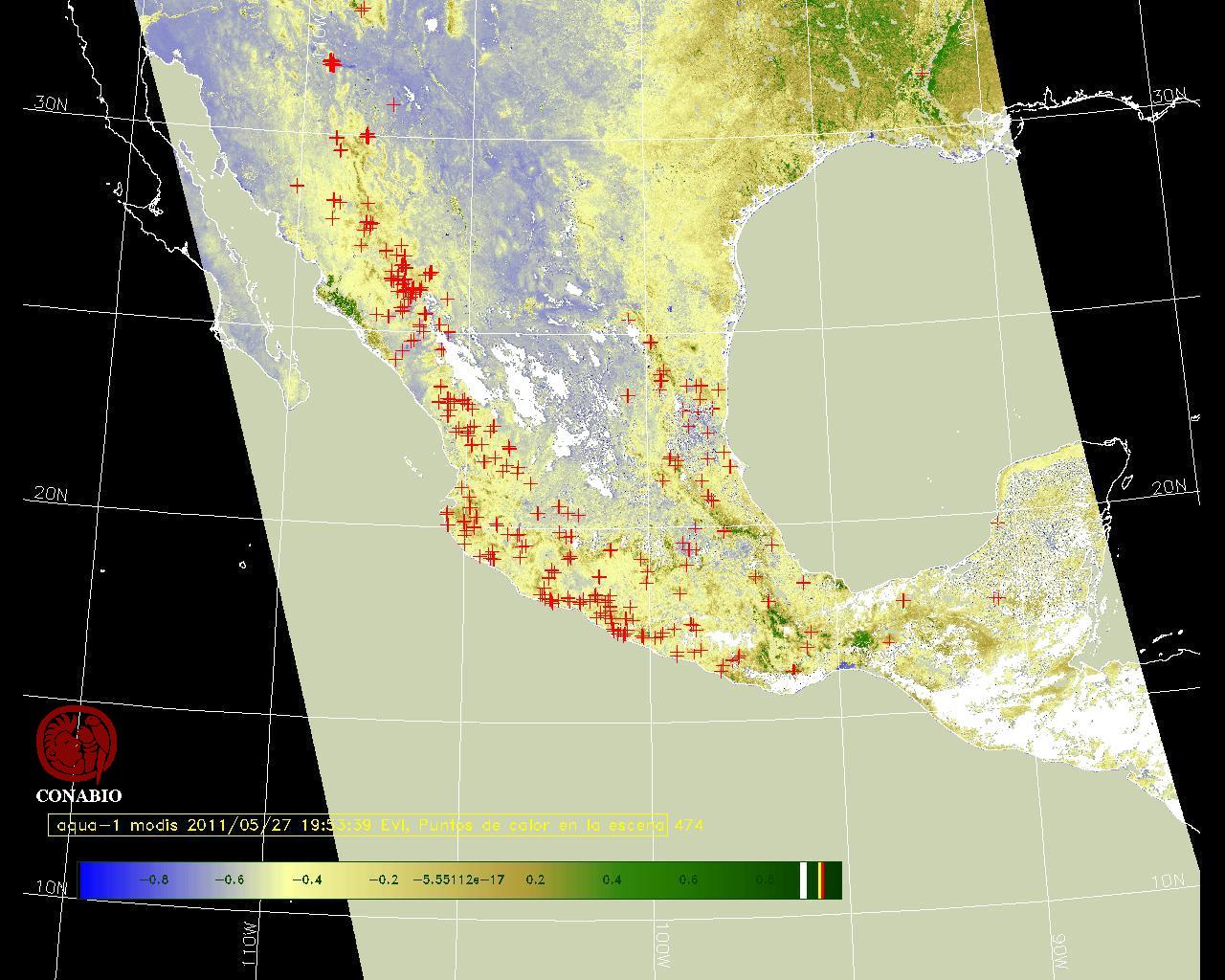 Se considera como punto de calor al elemento espacial mínimo de la imagen (pixel) que reporta una temperatura elevada. Para las imágenes diurnas la temperatura mínima considera es de 42 C y para las imágenes nocturnas es de 25 C. |