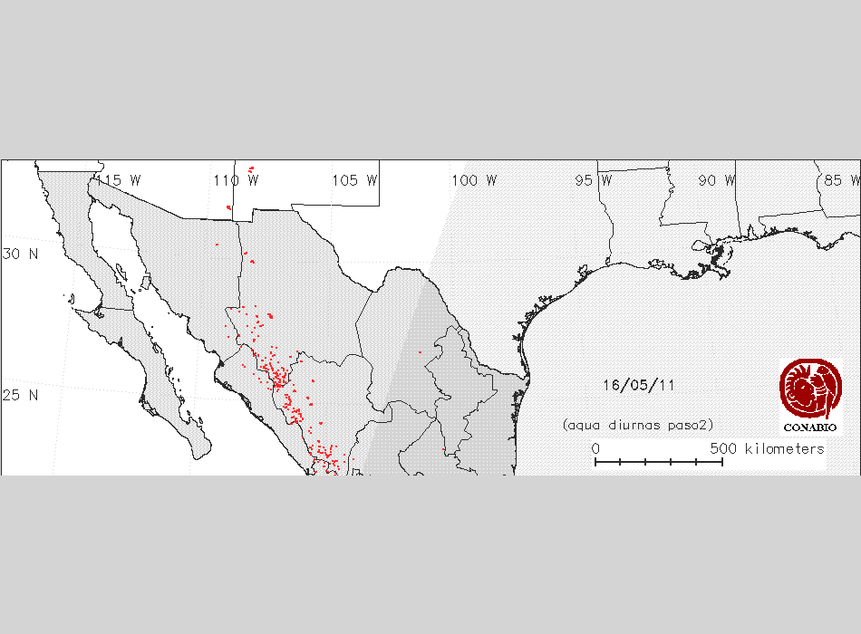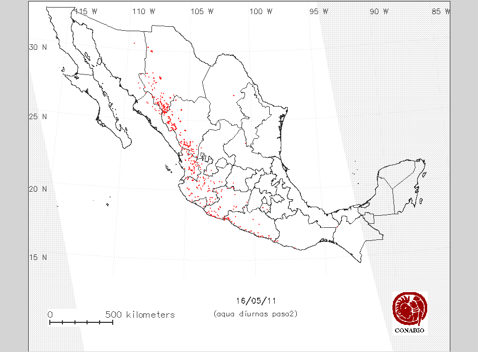 Se considera como punto de calor al elemento espacial mínimo de la imagen (pixel) que reporta una temperatura elevada. Para las imágenes diurnas la temperatura mínima considera es de 42 C y para las imágenes nocturnas es de 25 C. |