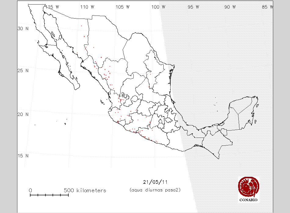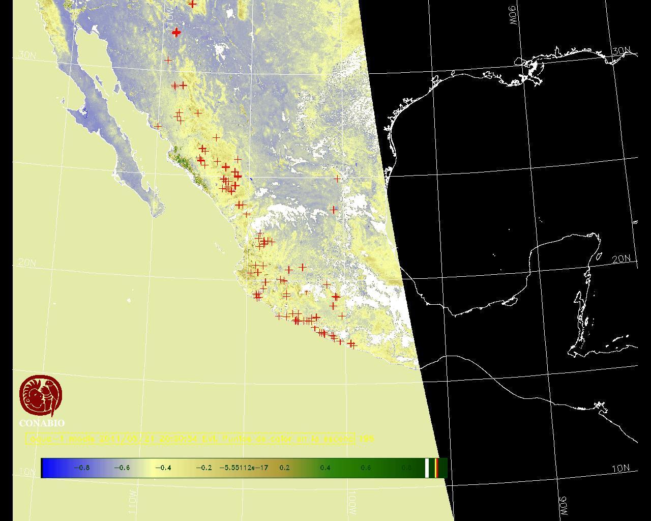 Se considera como punto de calor al elemento espacial mínimo de la imagen (pixel) que reporta una temperatura elevada. Para las imágenes diurnas la temperatura mínima considera es de 42 C y para las imágenes nocturnas es de 25 C. |