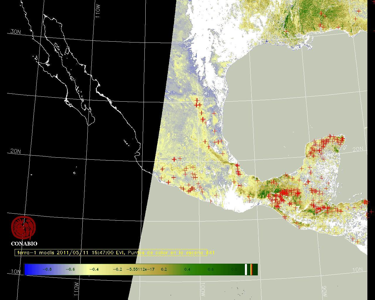 Se considera como punto de calor al elemento espacial mínimo de la imagen (pixel) que reporta una temperatura elevada. Para las imágenes diurnas la temperatura mínima considera es de 42 C y para las imágenes nocturnas es de 25 C. |