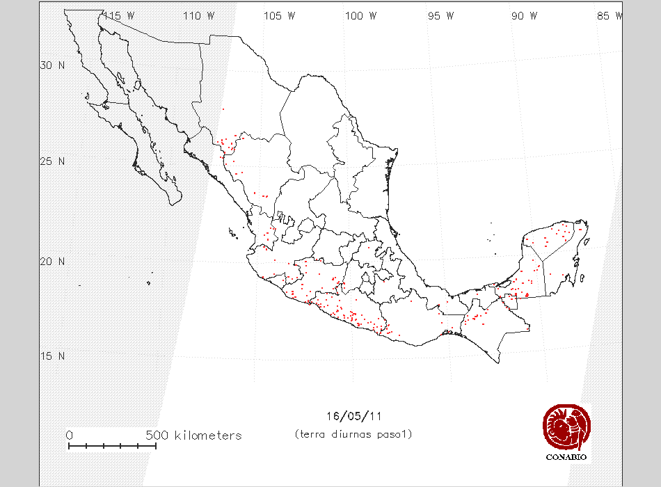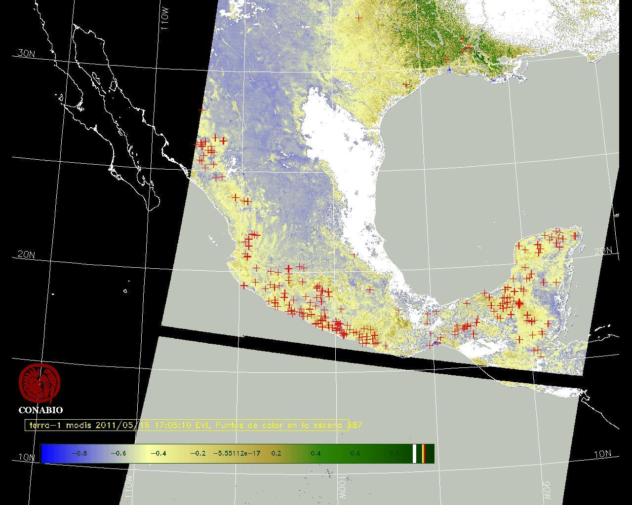 Se considera como punto de calor al elemento espacial mínimo de la imagen (pixel) que reporta una temperatura elevada. Para las imágenes diurnas la temperatura mínima considera es de 42 C y para las imágenes nocturnas es de 25 C. |