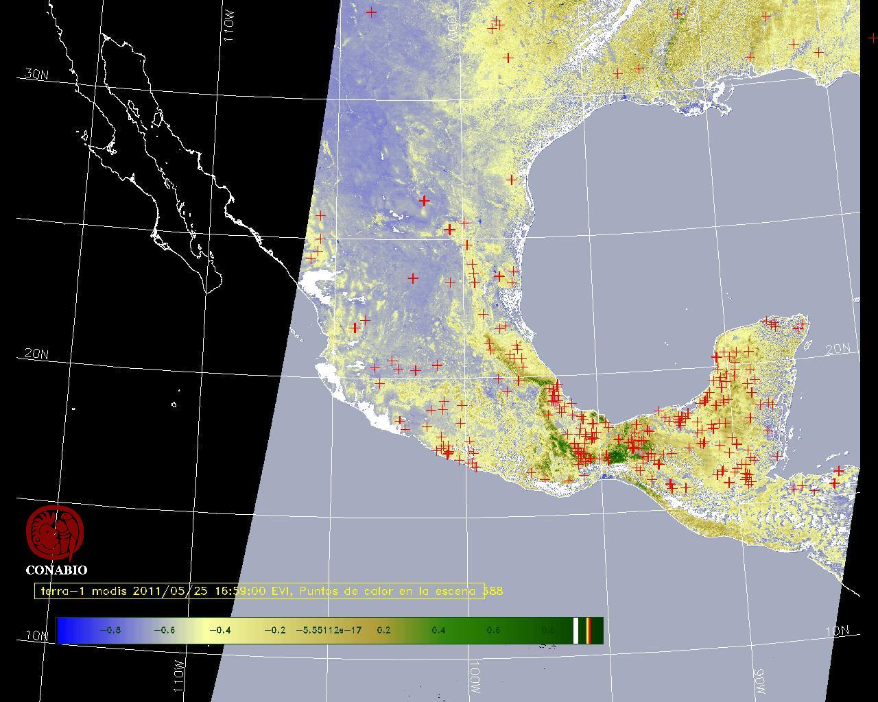 Se considera como punto de calor al elemento espacial mínimo de la imagen (pixel) que reporta una temperatura elevada. Para las imágenes diurnas la temperatura mínima considera es de 42 C y para las imágenes nocturnas es de 25 C. |