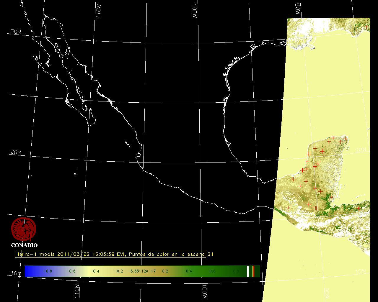 Se considera como punto de calor al elemento espacial mínimo de la imagen (pixel) que reporta una temperatura elevada. Para las imágenes diurnas la temperatura mínima considera es de 42 C y para las imágenes nocturnas es de 25 C. |