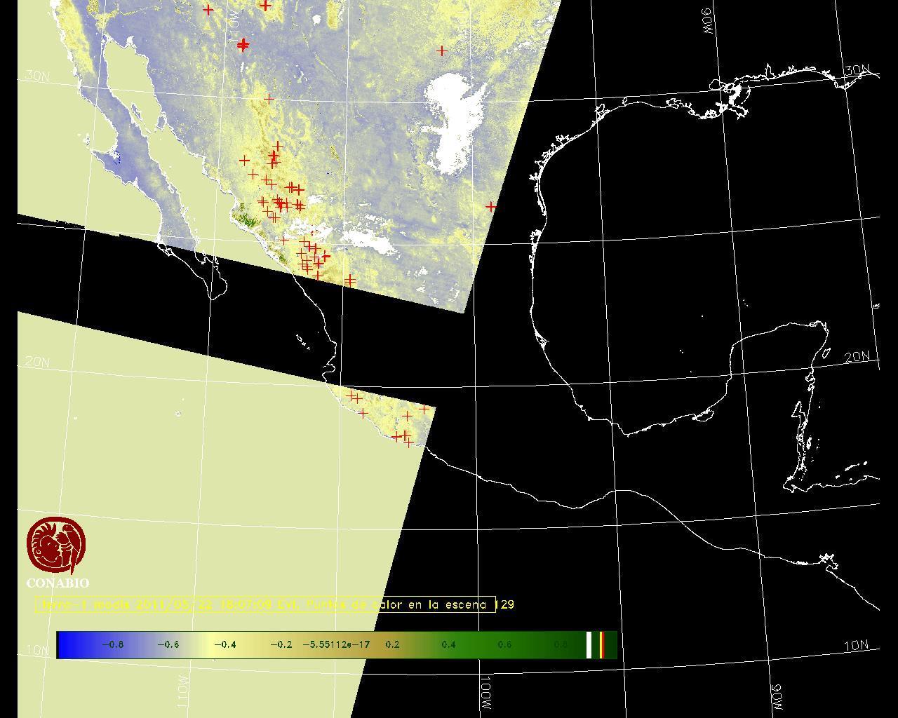 Se considera como punto de calor al elemento espacial mínimo de la imagen (pixel) que reporta una temperatura elevada. Para las imágenes diurnas la temperatura mínima considera es de 42 C y para las imágenes nocturnas es de 25 C. |
