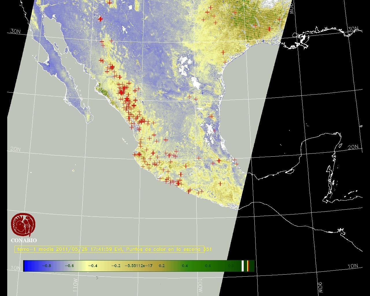 Se considera como punto de calor al elemento espacial mínimo de la imagen (pixel) que reporta una temperatura elevada. Para las imágenes diurnas la temperatura mínima considera es de 42 C y para las imágenes nocturnas es de 25 C. |