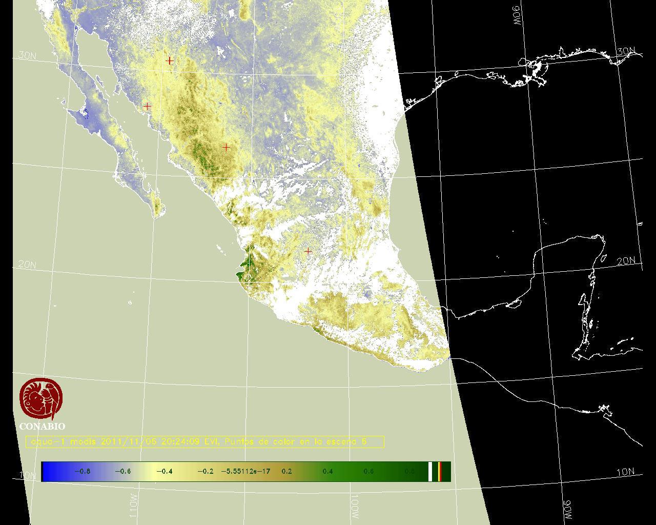 Se considera como punto de calor al elemento espacial mínimo de la imagen (pixel) que reporta una temperatura elevada. Para las imágenes diurnas la temperatura mínima considera es de 42 C y para las imágenes nocturnas es de 25 C. |