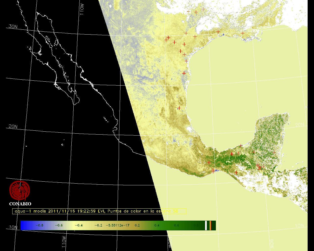 Se considera como punto de calor al elemento espacial mínimo de la imagen (pixel) que reporta una temperatura elevada. Para las imágenes diurnas la temperatura mínima considera es de 42 C y para las imágenes nocturnas es de 25 C. |