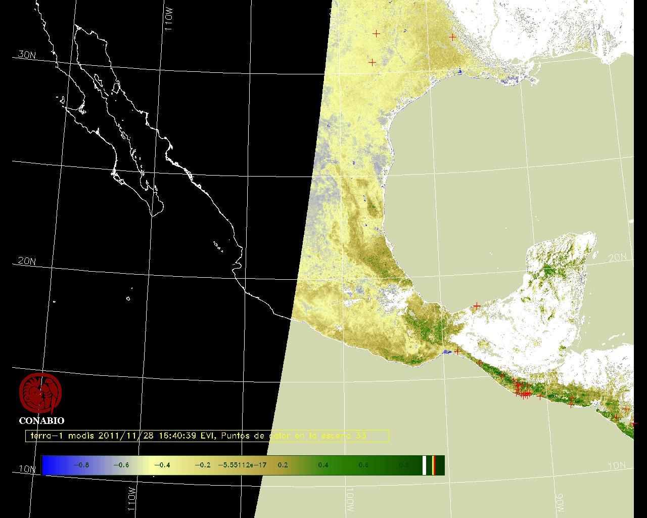 Se considera como punto de calor al elemento espacial mínimo de la imagen (pixel) que reporta una temperatura elevada. Para las imágenes diurnas la temperatura mínima considera es de 42 C y para las imágenes nocturnas es de 25 C. |