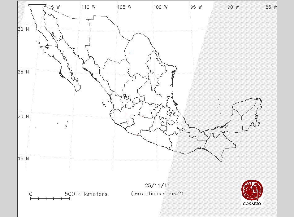 Se considera como punto de calor al elemento espacial mínimo de la imagen (pixel) que reporta una temperatura elevada. Para las imágenes diurnas la temperatura mínima considera es de 42 C y para las imágenes nocturnas es de 25 C. |