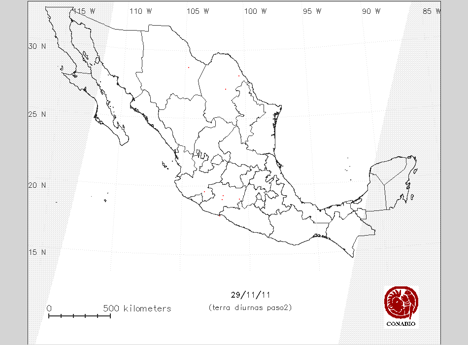 Se considera como punto de calor al elemento espacial mínimo de la imagen (pixel) que reporta una temperatura elevada. Para las imágenes diurnas la temperatura mínima considera es de 42 C y para las imágenes nocturnas es de 25 C. |