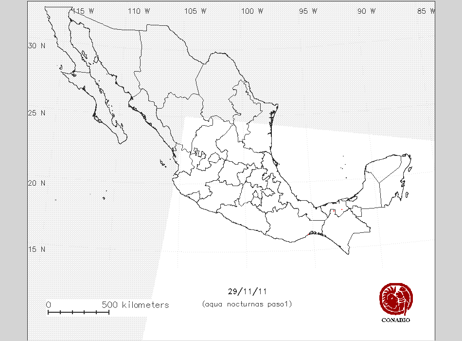 Se considera como punto de calor al elemento espacial mínimo de la imagen (pixel) que reporta una temperatura elevada. Para las imágenes diurnas la temperatura mínima considera es de 42 C y para las imágenes nocturnas es de 25 C. |