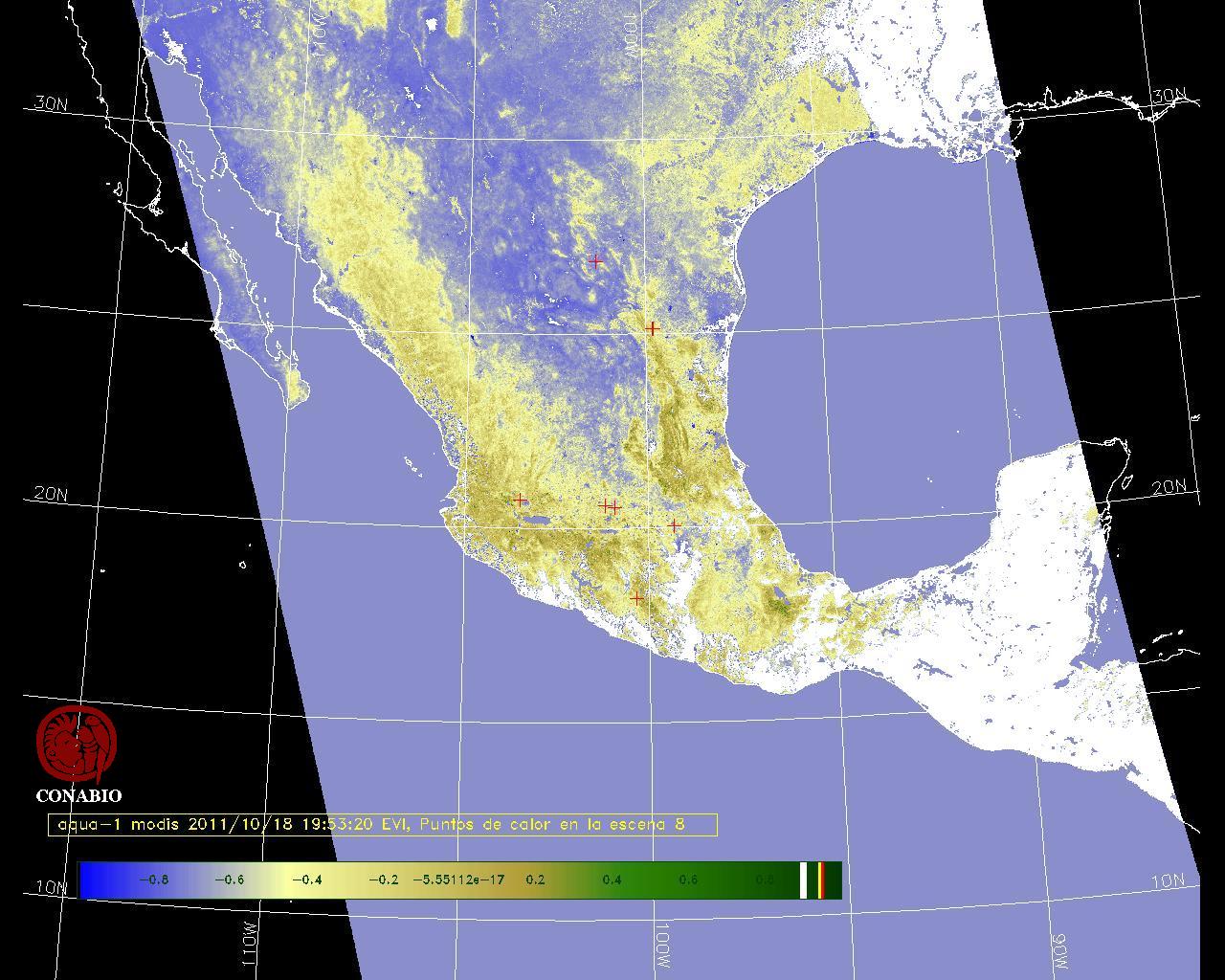 Se considera como punto de calor al elemento espacial mínimo de la imagen (pixel) que reporta una temperatura elevada. Para las imágenes diurnas la temperatura mínima considera es de 42 C y para las imágenes nocturnas es de 25 C. |