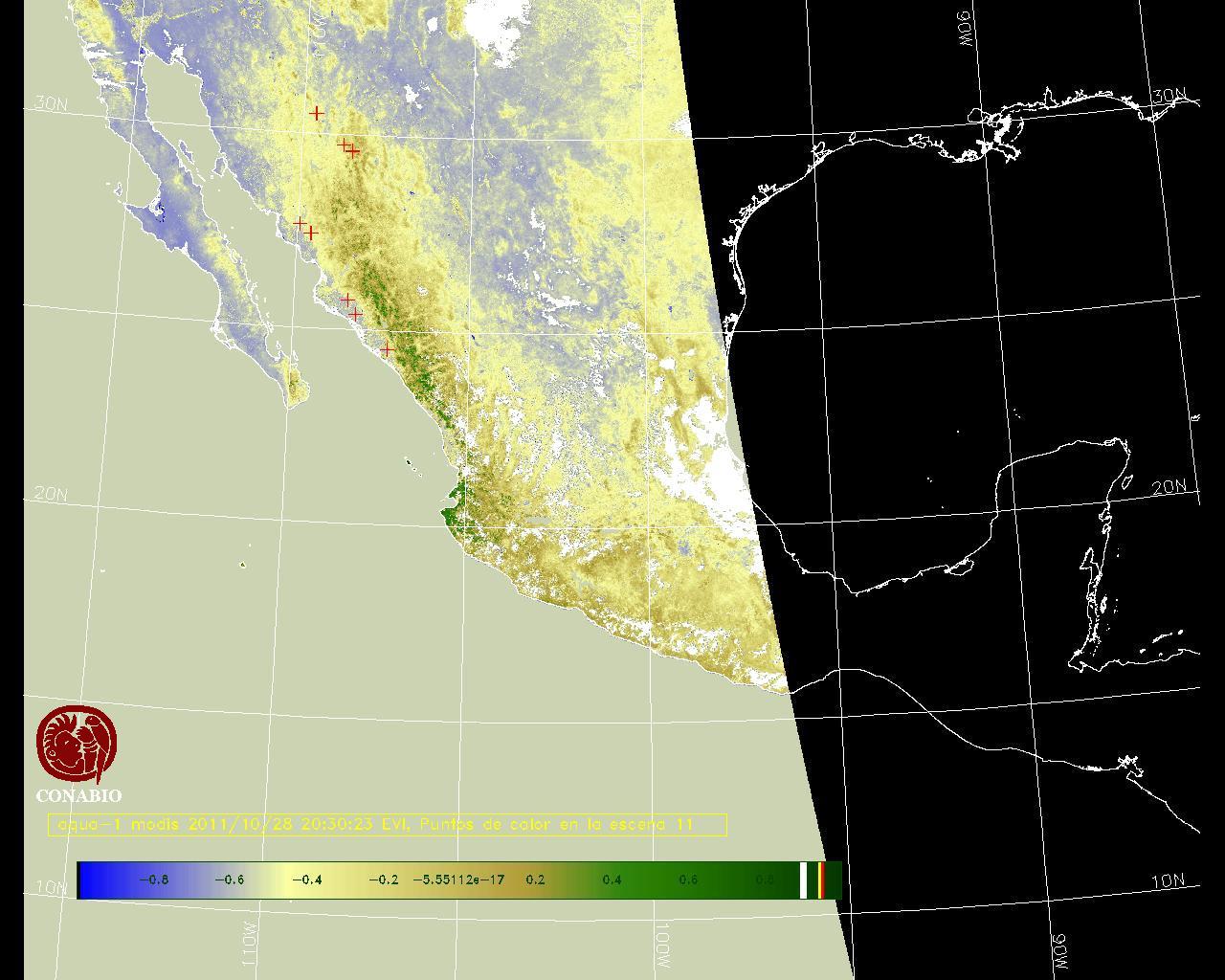 Se considera como punto de calor al elemento espacial mínimo de la imagen (pixel) que reporta una temperatura elevada. Para las imágenes diurnas la temperatura mínima considera es de 42 C y para las imágenes nocturnas es de 25 C. |