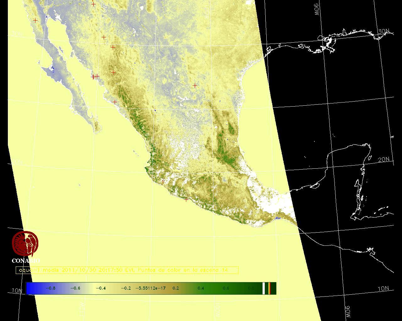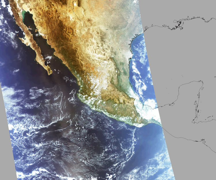 Nubosidad en el terreno:6% Nubosidad sobre México:8% Datos nulos en la escena:30% Datos nulos sobre México:11% |