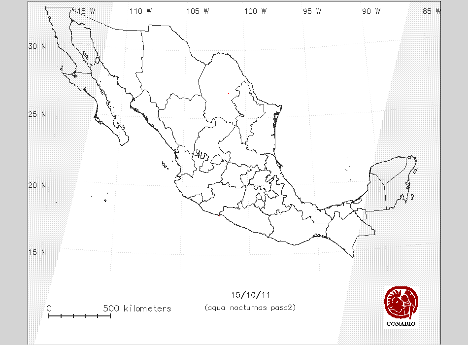 Se considera como punto de calor al elemento espacial mínimo de la imagen (pixel) que reporta una temperatura elevada. Para las imágenes diurnas la temperatura mínima considera es de 42 C y para las imágenes nocturnas es de 25 C. |
