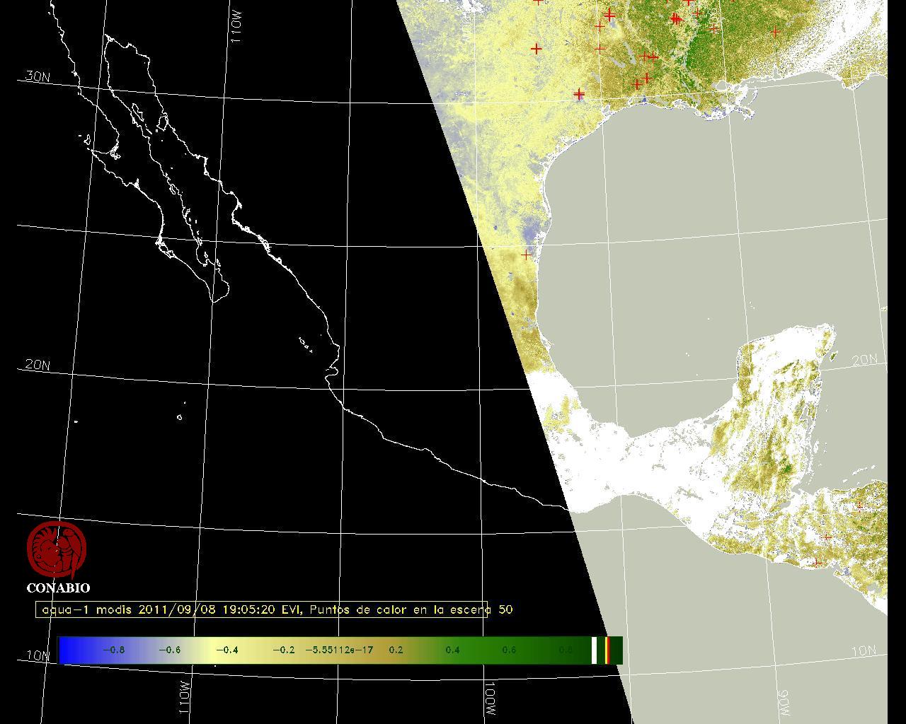 Se considera como punto de calor al elemento espacial mínimo de la imagen (pixel) que reporta una temperatura elevada. Para las imágenes diurnas la temperatura mínima considera es de 42 C y para las imágenes nocturnas es de 25 C. |