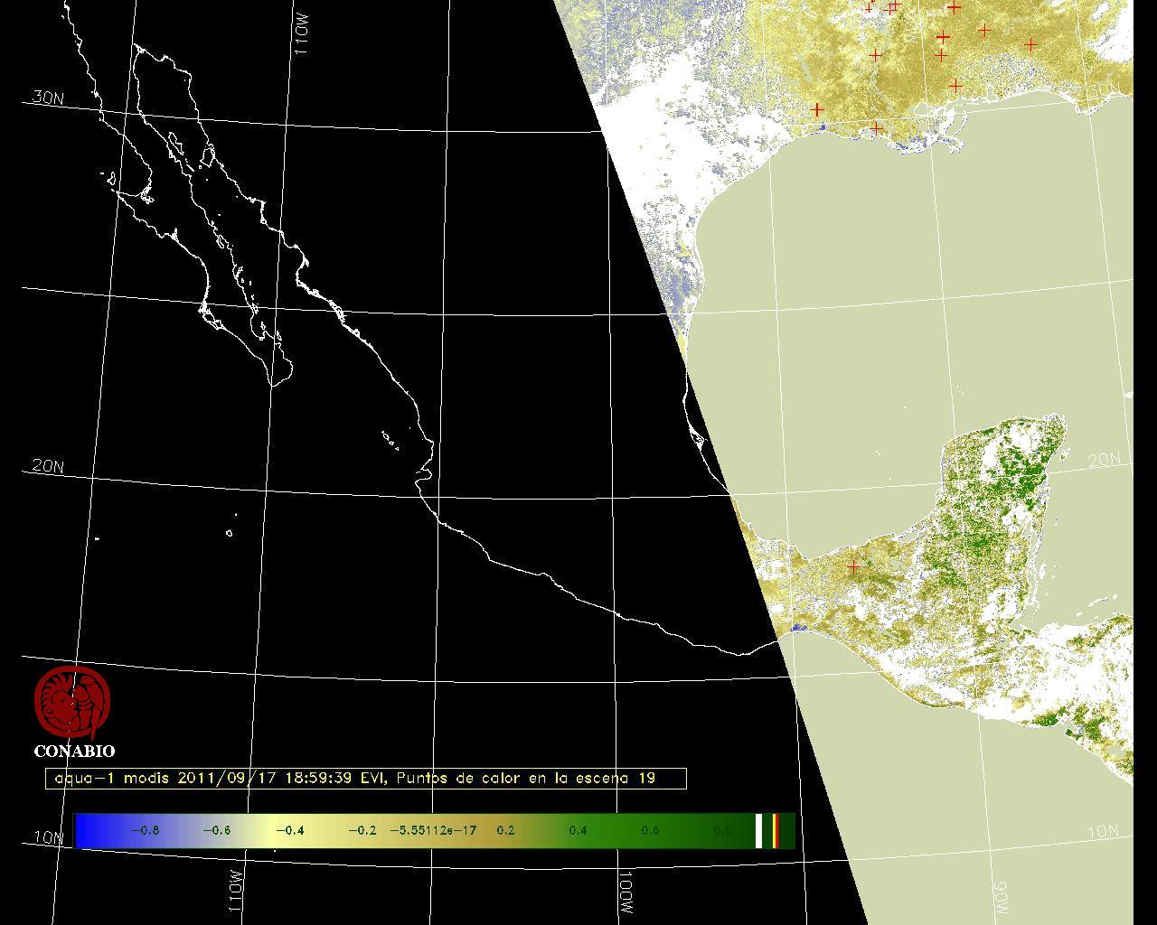 Se considera como punto de calor al elemento espacial mínimo de la imagen (pixel) que reporta una temperatura elevada. Para las imágenes diurnas la temperatura mínima considera es de 42 C y para las imágenes nocturnas es de 25 C. |