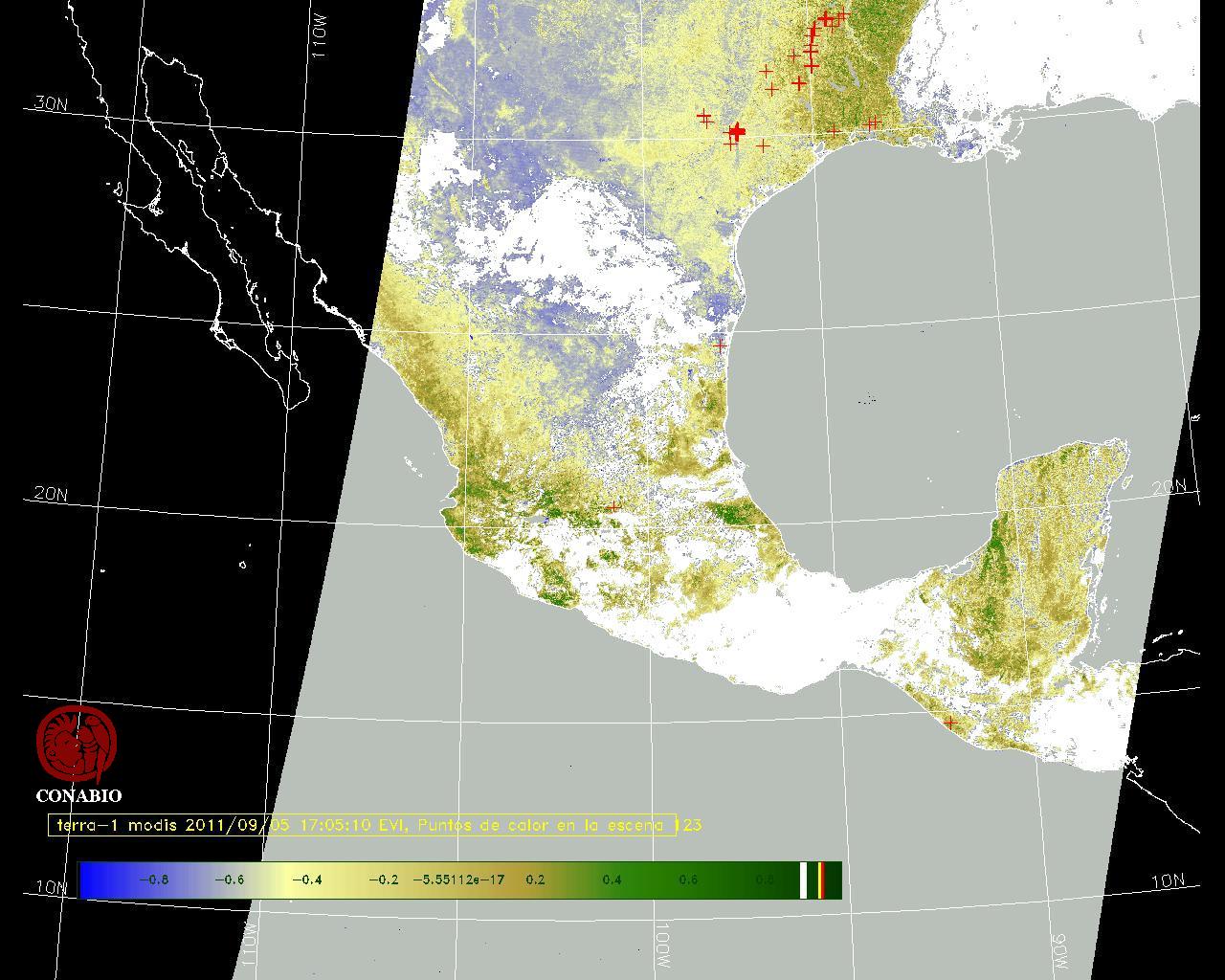 Se considera como punto de calor al elemento espacial mínimo de la imagen (pixel) que reporta una temperatura elevada. Para las imágenes diurnas la temperatura mínima considera es de 42 C y para las imágenes nocturnas es de 25 C. |