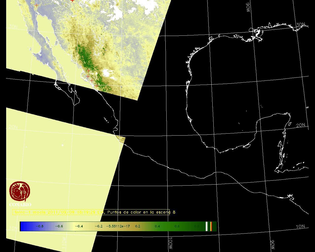 Se considera como punto de calor al elemento espacial mínimo de la imagen (pixel) que reporta una temperatura elevada. Para las imágenes diurnas la temperatura mínima considera es de 42 C y para las imágenes nocturnas es de 25 C. |