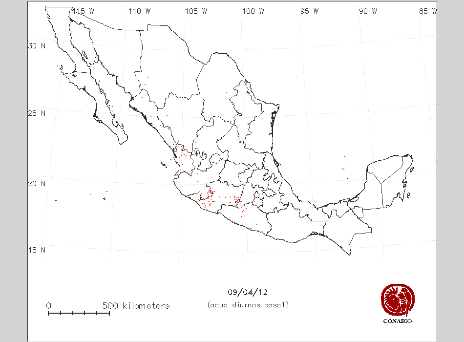 Se considera como punto de calor al elemento espacial mínimo de la imagen (pixel) que reporta una temperatura elevada. Para las imágenes diurnas la temperatura mínima considera es de 42 C y para las imágenes nocturnas es de 25 C. |