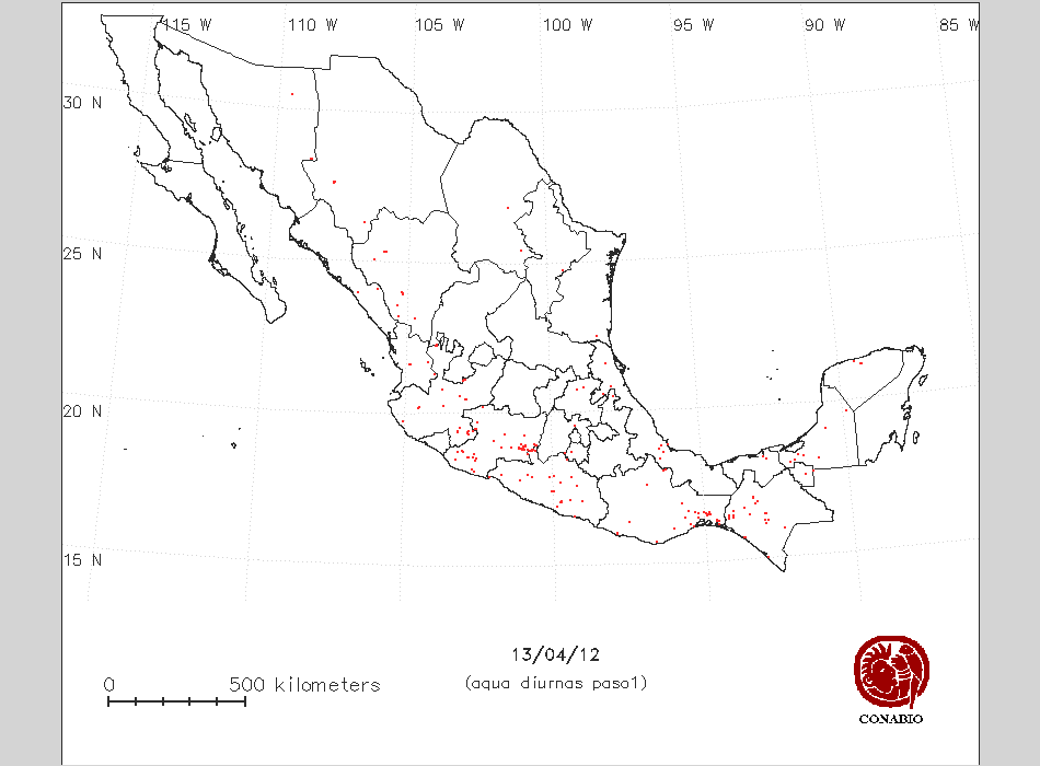 Se considera como punto de calor al elemento espacial mínimo de la imagen (pixel) que reporta una temperatura elevada. Para las imágenes diurnas la temperatura mínima considera es de 42 C y para las imágenes nocturnas es de 25 C. |