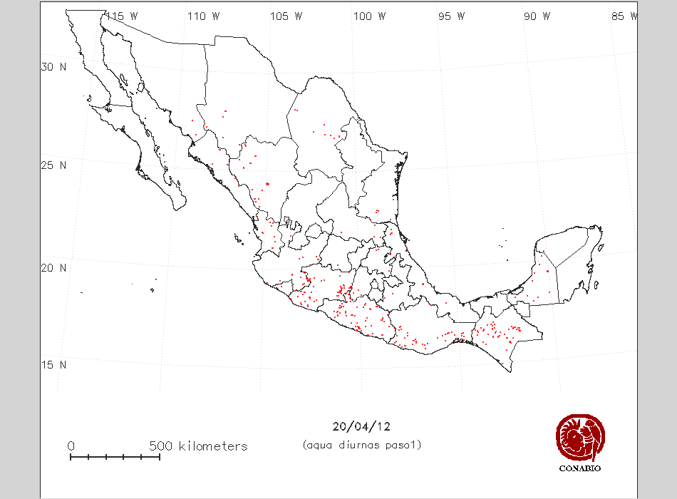 Se considera como punto de calor al elemento espacial mínimo de la imagen (pixel) que reporta una temperatura elevada. Para las imágenes diurnas la temperatura mínima considera es de 42 C y para las imágenes nocturnas es de 25 C. |