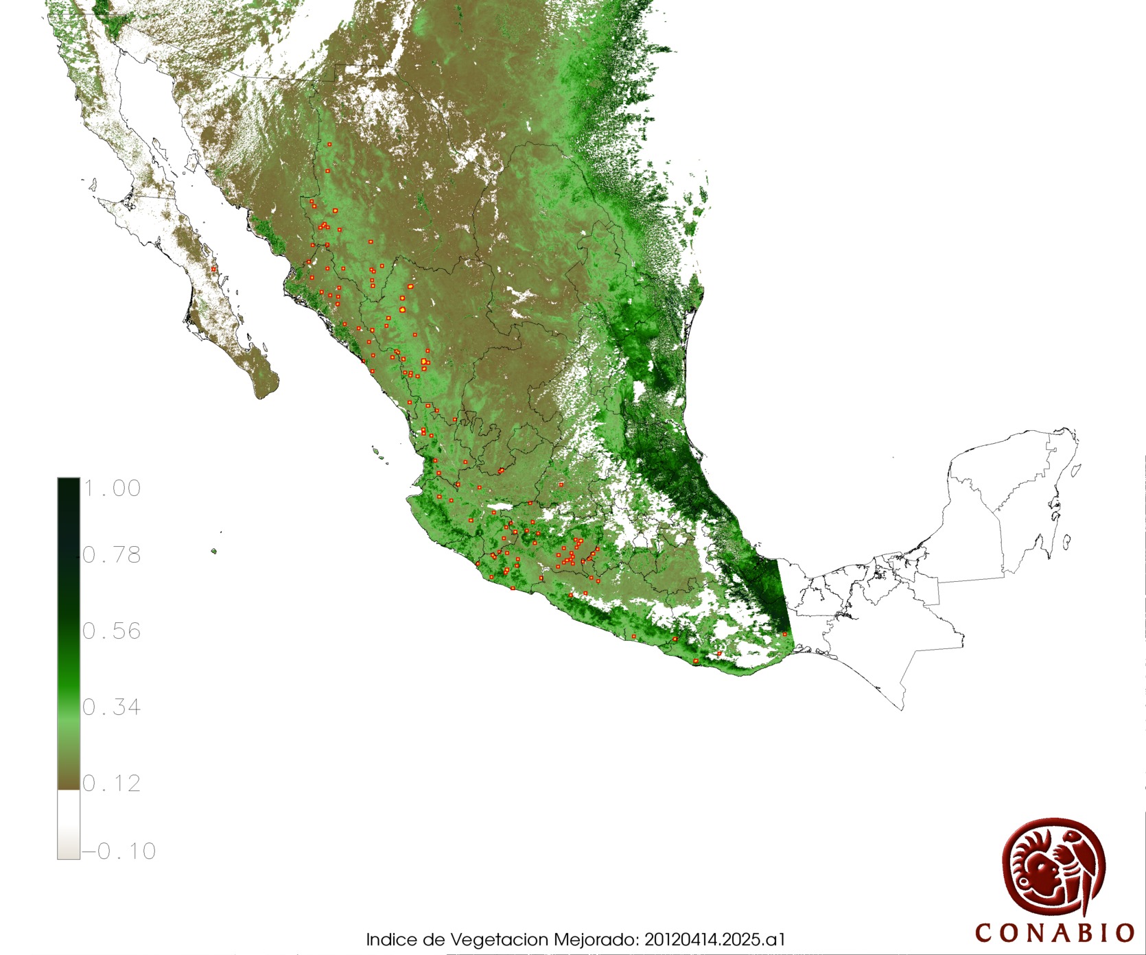 | X | 105 | -101 54 20 | 18 21 50 | Selva baja caducifolia | Arteaga,Michoacán | ZICUIRAN-INFIERNILLO | 29 ° | Bajo | |