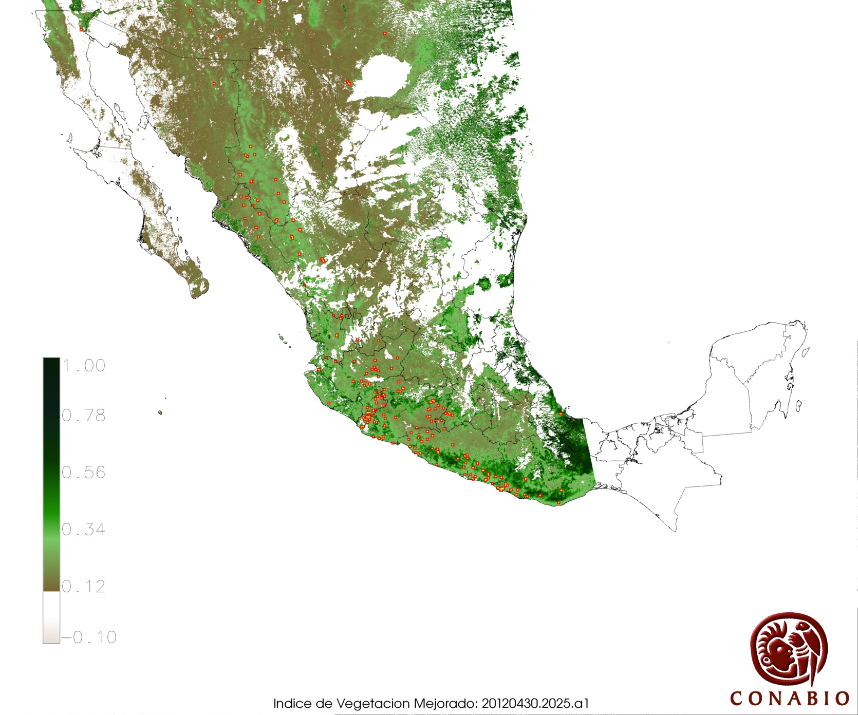 | X= Vegetación con alta susceptibilidad de incendios | Nota: Para obtener puntos de calor sobre un Modelo Digital del Terreno y Vegetación, seleccionar el número en la columna "Indice". Los siguientes usos de suelo se muestran en gris: agricultura, área sin vegetación, cuerpos de agua, pastizal cultivado e inducido. |